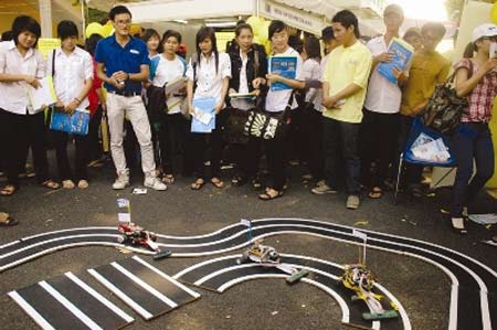 Sinh viên Trường ĐH Kỹ thuật Công nghệ TPHCM biểu diễn điều khiển xe mô hình do trường chế tạo để giúp thí sinh hình dung về ngành học